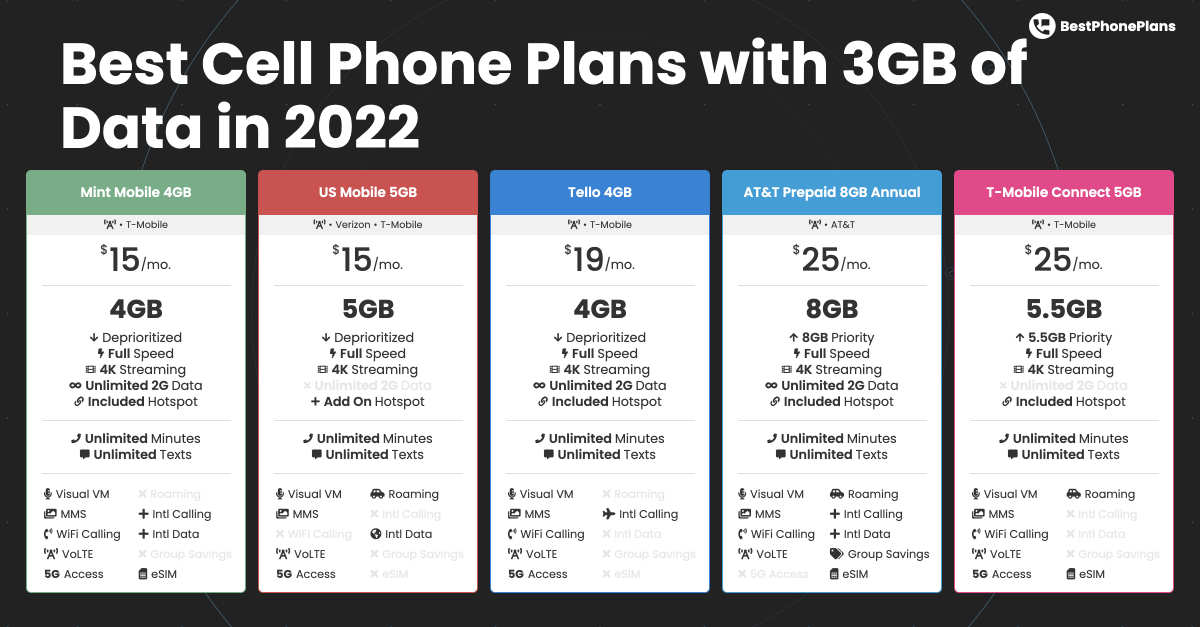 In our opinion, 3GB is perfect for light cell phone usage. It’s just the right amount for streaming music on a short commute to work, occasionally getting Google Maps directions, browsing the web, booking appointments, and some social media use.